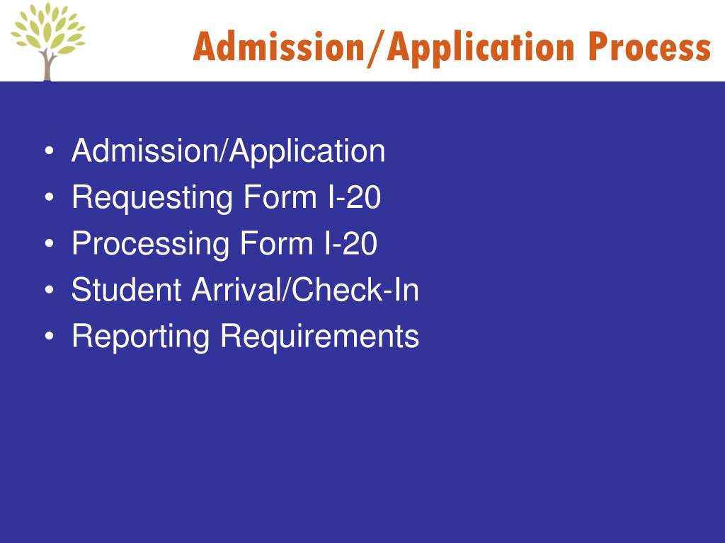 Admission/Application Process Admission/Application Requesting Form I-20 Processing Form I-20 Student Arrival/Check-In Reporting Requirements