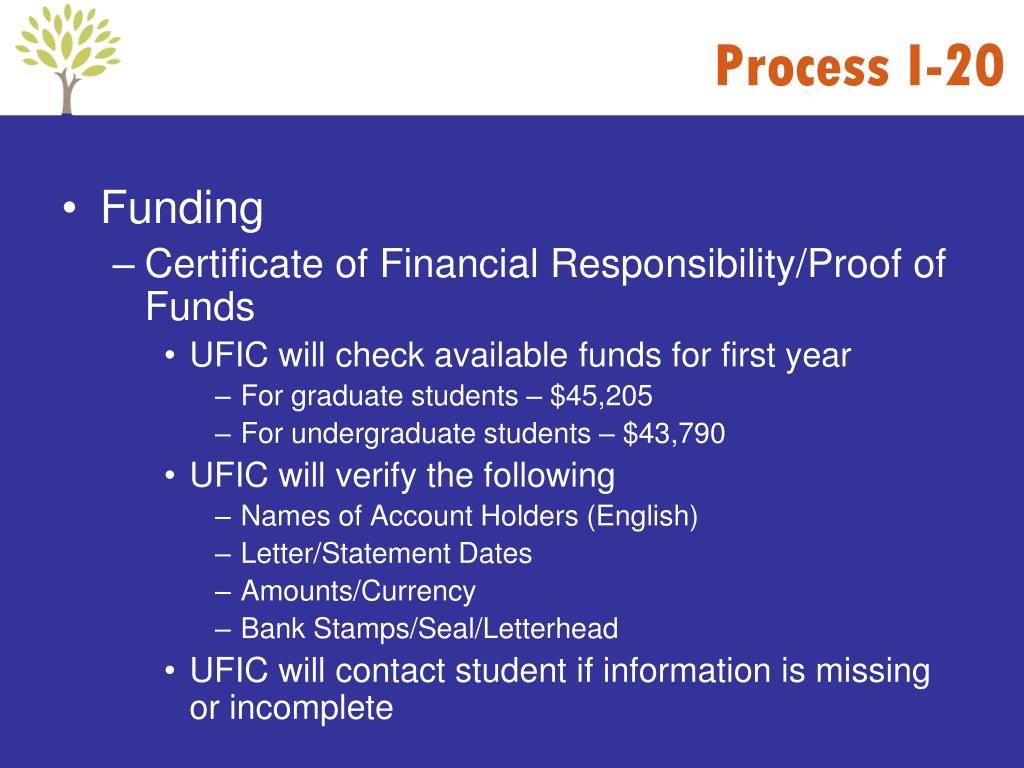 Process I-20 (cont.) • Funding • Certificate of Financial Responsibility/Proof of Funds