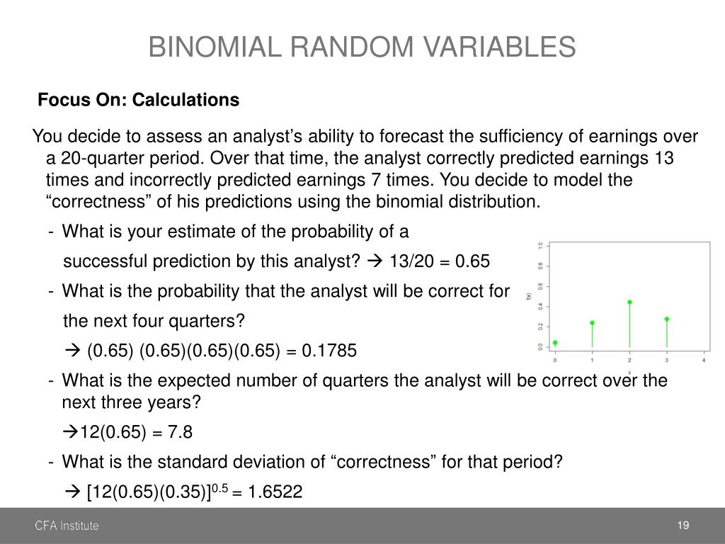 Binomial Random Variables Focus On: Calculations You decide to assess an analyst’s ability to forecast the sufficiency of earnings over a 20-quarter period. Over that time, the analyst correctly predicted earnings 13 times and incorrectly predicted earnings 7 times. You decide to model the “correctness” of his predictions using the binomial distribution. What is your estimate of the probability of a successful prediction by this analyst? 13/20 = 0.65 What is the probability that the analyst will be correct for the next four quarters? (0.65) (0.65)(0.65)(0.65) = 0.1785 What is the expected number of quarters the analyst will be correct over the next three years? 12(0.65) = 7.8 What is the standard deviation of “correctness” for that period? [12(0.65)(0.35)]0.5 = 1.6522
