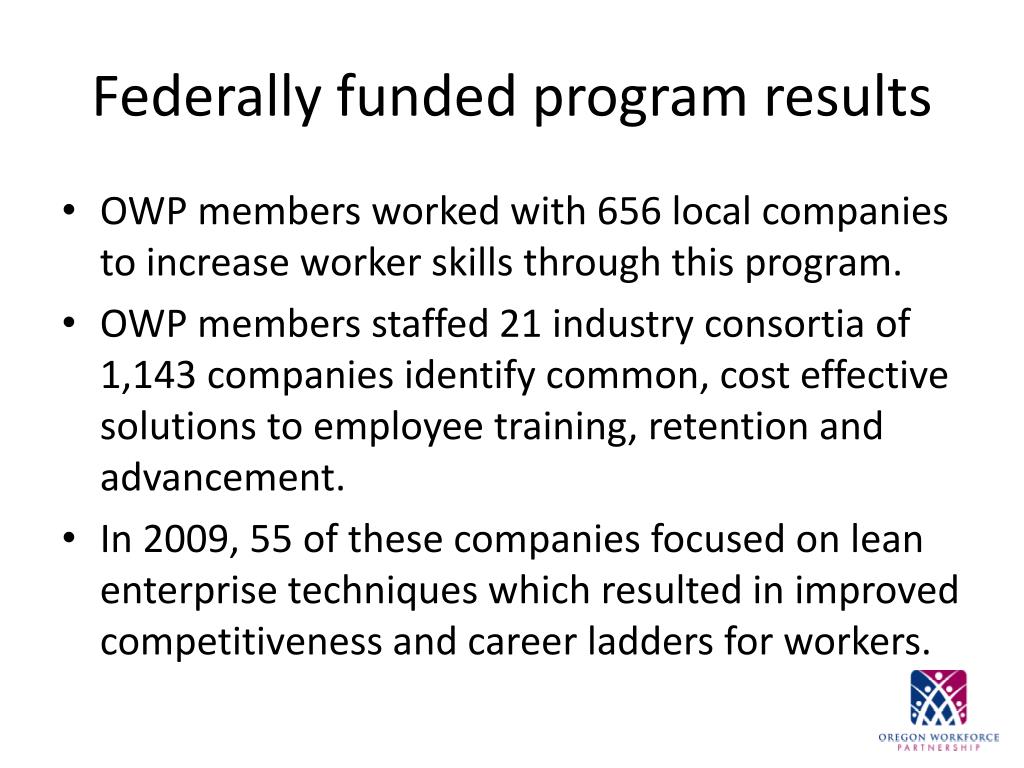 Federally funded program results • OWP members worked with 656 local companies to increase worker skills through this program. • OWP members staffed 21 industry consortia of 1,143 companies identify common, cost effective solutions to employee training, retention and advancement. • In 2009, 55 of these companies focused on lean enterprise techniques which resulted in improved competitiveness and career ladders for workers.