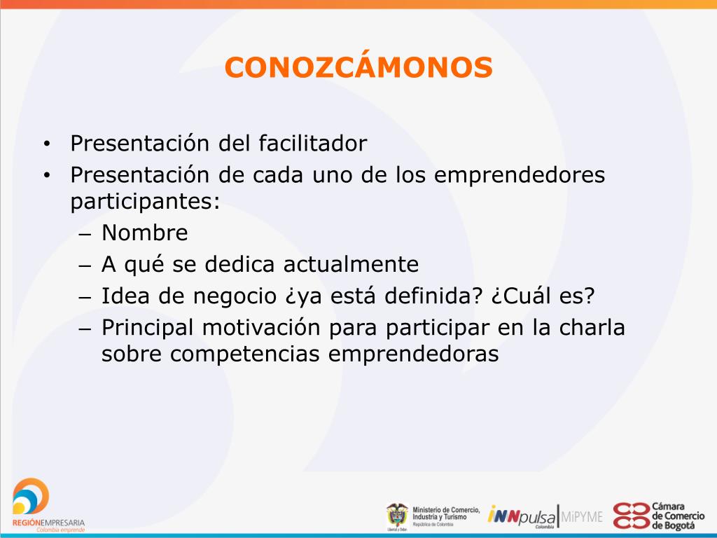 CONOZCÁMONOS • Presentación del facilitador • Presentación de cada uno de los emprendedores participantes: • Nombre • A qué se dedica actualmente • Idea de negocio ¿ya está definida? ¿Cuál es? • Principal motivación para participar en la charla sobre competencias emprendedoras