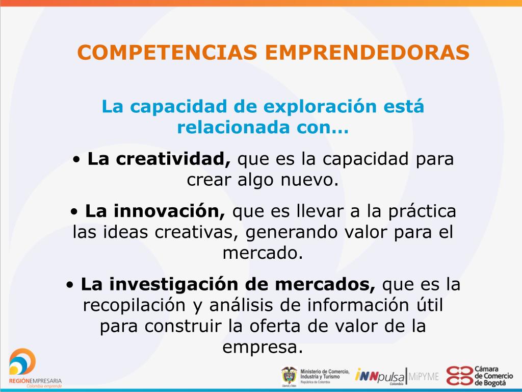 COMPETENCIAS EMPRENDEDORAS • La capacidad de exploración está relacionada con… • La creatividad,que es la capacidad para crear algo nuevo. • La innovación,que es llevar a la práctica las ideas creativas, generando valor para el mercado. • La investigación de mercados,que es la recopilación y análisis de información útil para construir la oferta de valor de la empresa.