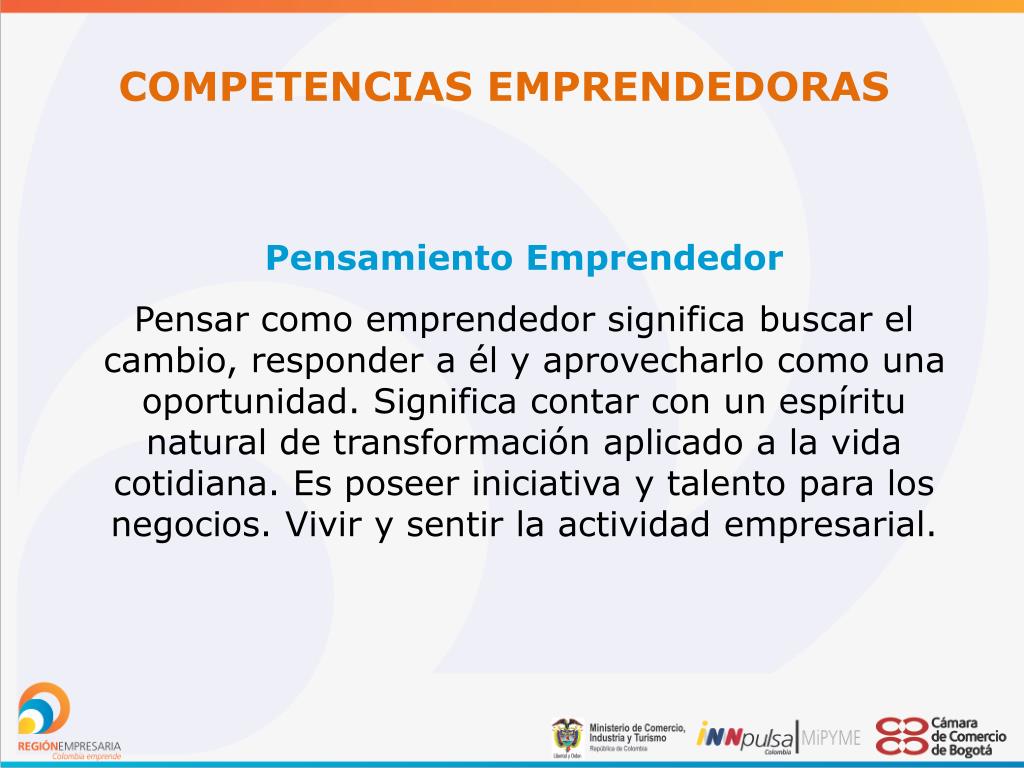 COMPETENCIAS EMPRENDEDORAS Pensamiento Emprendedor Pensar como emprendedor significa buscar el cambio, responder a él y aprovecharlo como una oportunidad. Significa contar con un espíritu natural de transformación aplicado a la vida cotidiana. Es poseer iniciativa y talento para los negocios. Vivir y sentir la actividad empresarial.