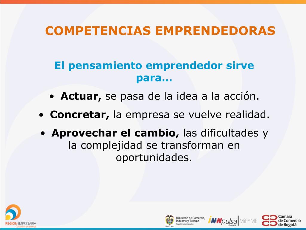 COMPETENCIAS EMPRENDEDORAS • El pensamiento emprendedor sirve para… • Actuar, se pasa de la idea a la acción. • Concretar, la empresa se vuelve realidad. • Aprovechar el cambio, las dificultades y la complejidad se transforman en oportunidades.