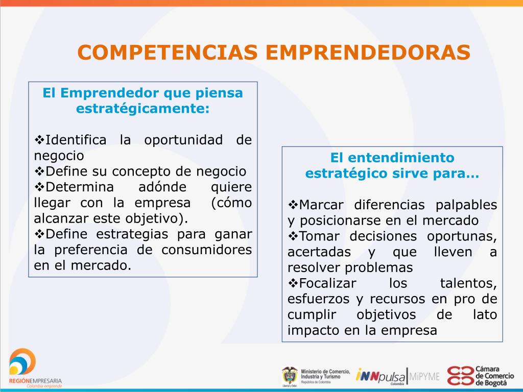 COMPETENCIAS EMPRENDEDORAS Entendimiento estratégico Es la forma racional de comprender los fenómenos que se dan en una situación actual y cambiante, identificando y aprovechando sistemáticamente las oportunidades que se presentan en el entorno. Es tener claro en dónde se está y adónde se quiere llegar, así como saber construir el camino para llegar a donde se pretende. Es saber mirar el bosque, con visión y proyección.