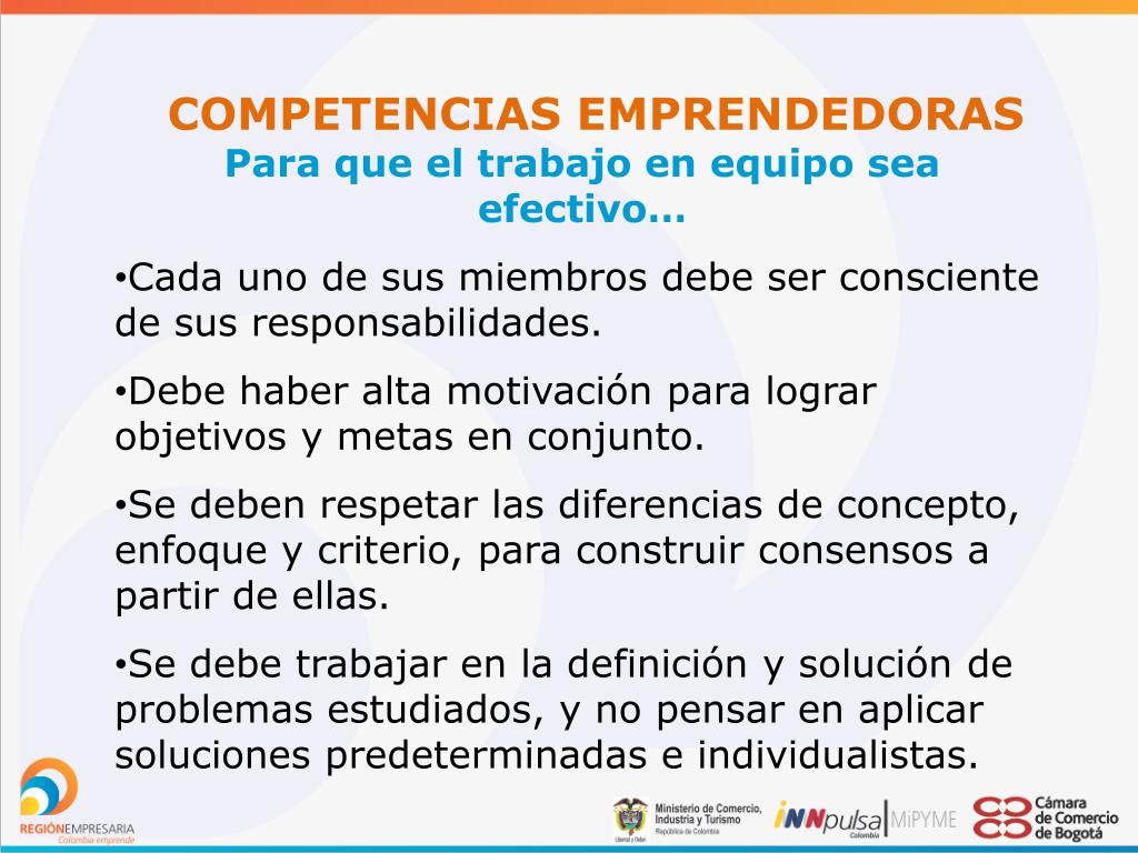 COMPETENCIAS EMPRENDEDORAS • Para que el trabajo en equipo sea efectivo… • Cada uno de sus miembros debe ser consciente de sus responsabilidades. • Debe haber alta motivación para lograr objetivos y metas en conjunto. • Se deben respetar las diferencias de concepto, enfoque y criterio, para construir consensos a partir de ellas. • Se debe trabajar en la definición y solución de problemas estudiados, y no pensar en aplicar soluciones predeterminadas e individualistas.