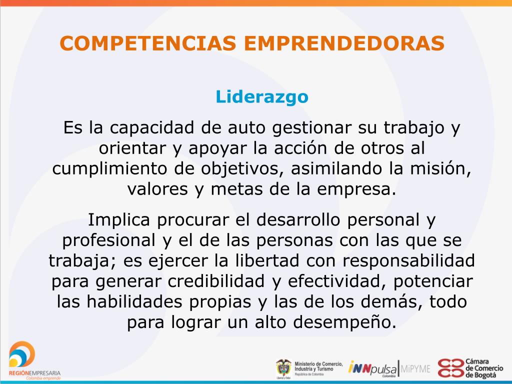 COMPETENCIAS EMPRENDEDORAS Liderazgo Es la capacidad de auto gestionar su trabajo y orientar y apoyar la acción de otros al cumplimiento de objetivos, asimilando la misión, valores y metas de la empresa. Implica procurar el desarrollo personal y profesional y el de las personas con las que se trabaja; es ejercer la libertad con responsabilidad para generar credibilidad y efectividad, potenciar las habilidades propias y las de los demás, todo para lograr un alto desempeño.