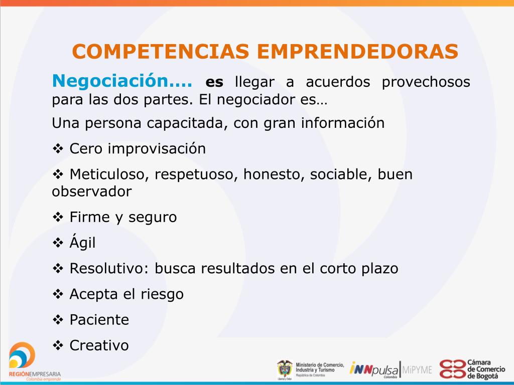COMPETENCIAS EMPRENDEDORAS Negociación…. es llegar a acuerdos provechosos para las dos partes. El negociador es… • Una persona capacitada, con gran información • Cero improvisación • Meticuloso, respetuoso, honesto, sociable, buen observador • Firme y seguro • Ágil • Resolutivo: busca resultados en el corto plazo • Acepta el riesgo • Paciente • Creativo