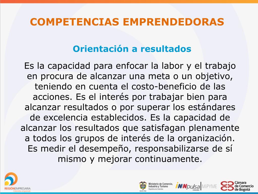 COMPETENCIAS EMPRENDEDORAS Orientación a resultados Es la capacidad para enfocar la labor y el trabajo en procura de alcanzar una meta o un objetivo, teniendo en cuenta el costo-beneficio de las acciones. Es el interés por trabajar bien para alcanzar resultados o por superar los estándares de excelencia establecidos. Es la capacidad de alcanzar los resultados que satisfagan plenamente a todos los grupos de interés de la organización. Es medir el desempeño, responsabilizarse de sí mismo y mejorar continuamente.