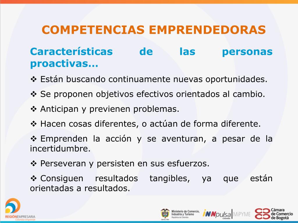 COMPETENCIAS EMPRENDEDORAS Proactividad La proactividad consiste en tomar la iniciativa, proponer, anticiparse, asumiendo la responsabilidad de hacer que las cosas sucedan; decidir en cada momento lo que queremos hacer y cómo lo vamos a hacer, actuando de manera efectiva.