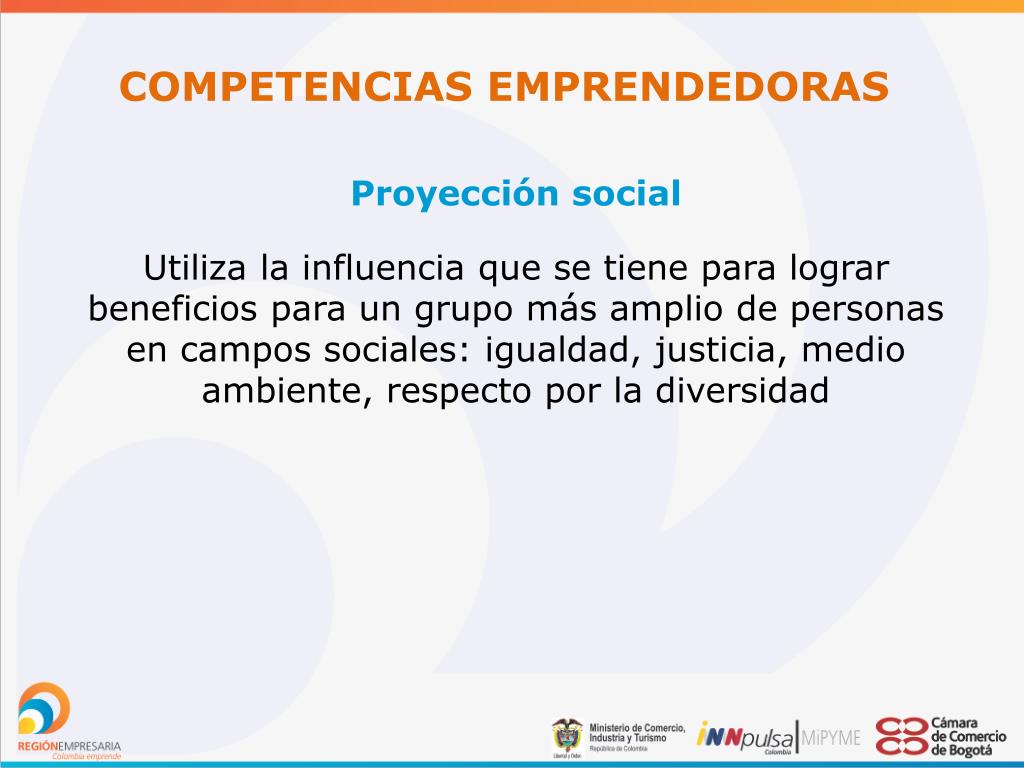 COMPETENCIAS EMPRENDEDORAS Proyección social Utiliza la influencia que se tiene para lograr beneficios para un grupo más amplio de personas en campos sociales: igualdad, justicia, medio ambiente, respecto por la diversidad