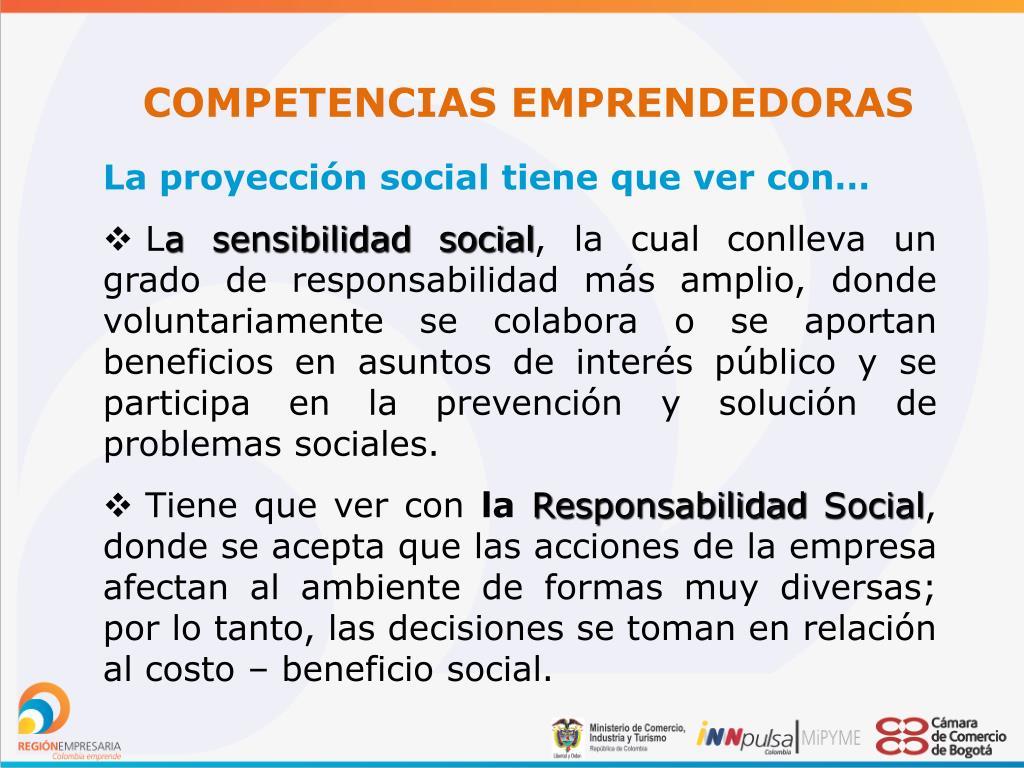COMPETENCIAS EMPRENDEDORAS • La proyección social tiene que ver con… • La sensibilidad social, la cual conlleva un grado de responsabilidad más amplio, donde voluntariamente se colabora o se aportan beneficios en asuntos de interés público y se participa en la prevención y solución de problemas sociales. • Tiene que ver conla Responsabilidad Social, dondese acepta que las acciones de la empresa afectan al ambiente de formas muy diversas; por lo tanto, las decisiones se toman en relación al costo – beneficio social.