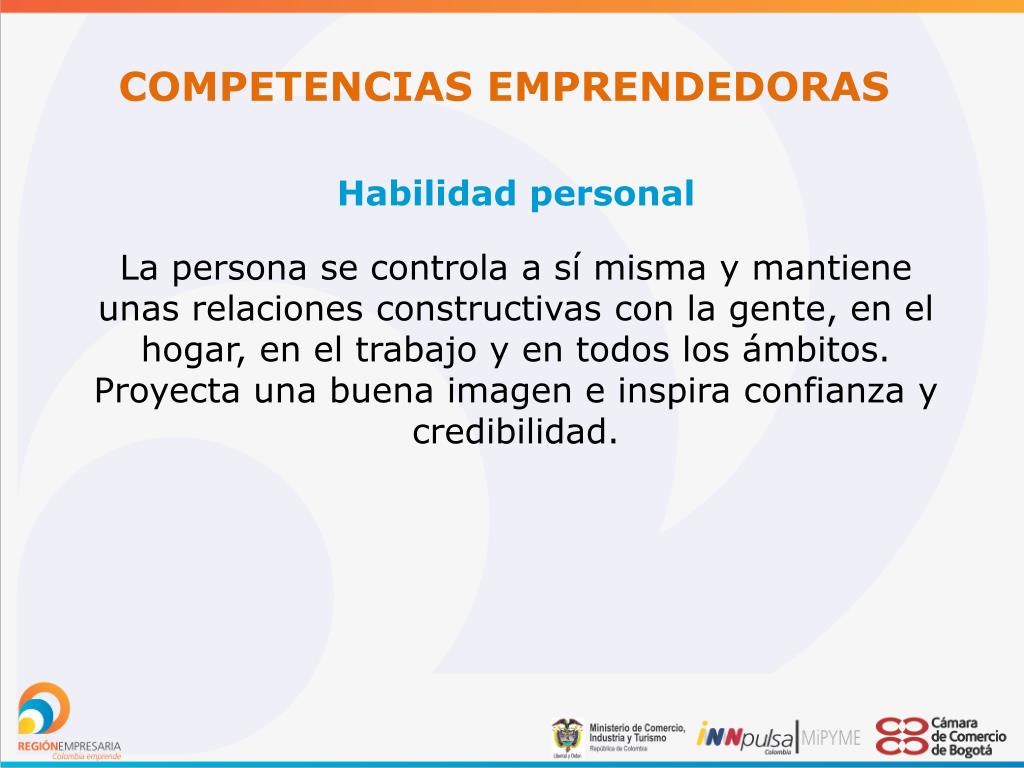 COMPETENCIAS EMPRENDEDORAS Habilidad personal La persona se controla a sí misma y mantiene unas relaciones constructivas con la gente, en el hogar, en el trabajo y en todos los ámbitos. Proyecta una buena imagen e inspira confianza y credibilidad.