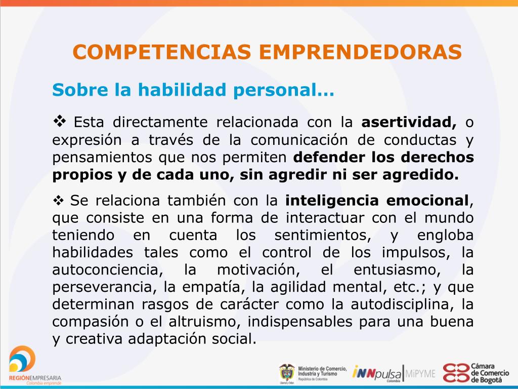 COMPETENCIAS EMPRENDEDORAS • Sobre la habilidad personal… • Esta directamente relacionada con la asertividad, o expresión a través de la comunicación de conductas y pensamientos que nos permiten defender los derechos propios y de cada uno, sin agredir ni ser agredido. • Se relaciona también con la inteligencia emocional, que consiste en una forma de interactuar con el mundo teniendo en cuenta los sentimientos, y engloba habilidades tales como el control de los impulsos, la autoconciencia, la motivación, el entusiasmo, la perseverancia, la empatía, la agilidad mental, etc.; y que determinan rasgos de carácter como la autodisciplina, la compasión o el altruismo, indispensables para una buena y creativa adaptación social.