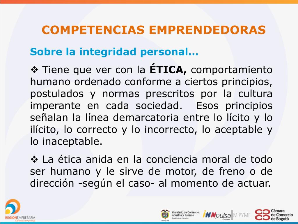COMPETENCIAS EMPRENDEDORAS • Sobre la integridad personal… • Tiene que ver con la ÉTICA, comportamiento humano ordenado conforme a ciertos principios, postulados y normas prescritos por la cultura imperante en cada sociedad. Esos principios señalan la línea demarcatoria entre lo lícito y lo ilícito, lo correcto y lo incorrecto, lo aceptable y lo inaceptable. • La ética anida en la conciencia moral de todo ser humano y le sirve de motor, de freno o de dirección -según el caso- al momento de actuar.