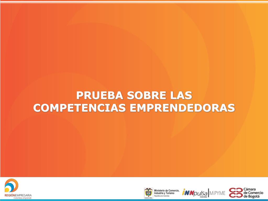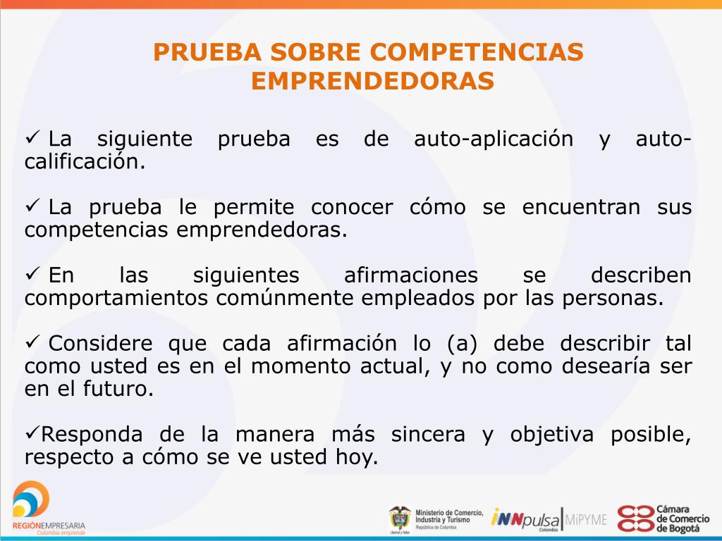 PRUEBA SOBRE COMPETENCIAS EMPRENDEDORAS • La siguiente prueba es de auto-aplicación y auto- calificación. • La prueba le permite conocer cómo se encuentran sus competencias emprendedoras. • En las siguientes afirmaciones se describen comportamientos comúnmente empleados por las personas. • Considere que cada afirmación lo (a) debe describir tal como usted es en el momento actual, y no como desearía ser en el futuro. • Responda de la manera más sincera y objetiva posible, respecto a cómo se ve usted hoy.