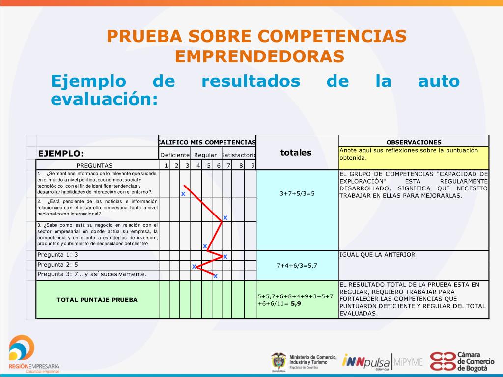 PRUEBA SOBRE COMPETENCIAS EMPRENDEDORAS Ejemplo de resultados de la auto evaluación: