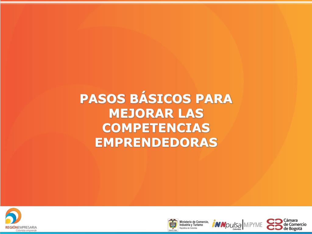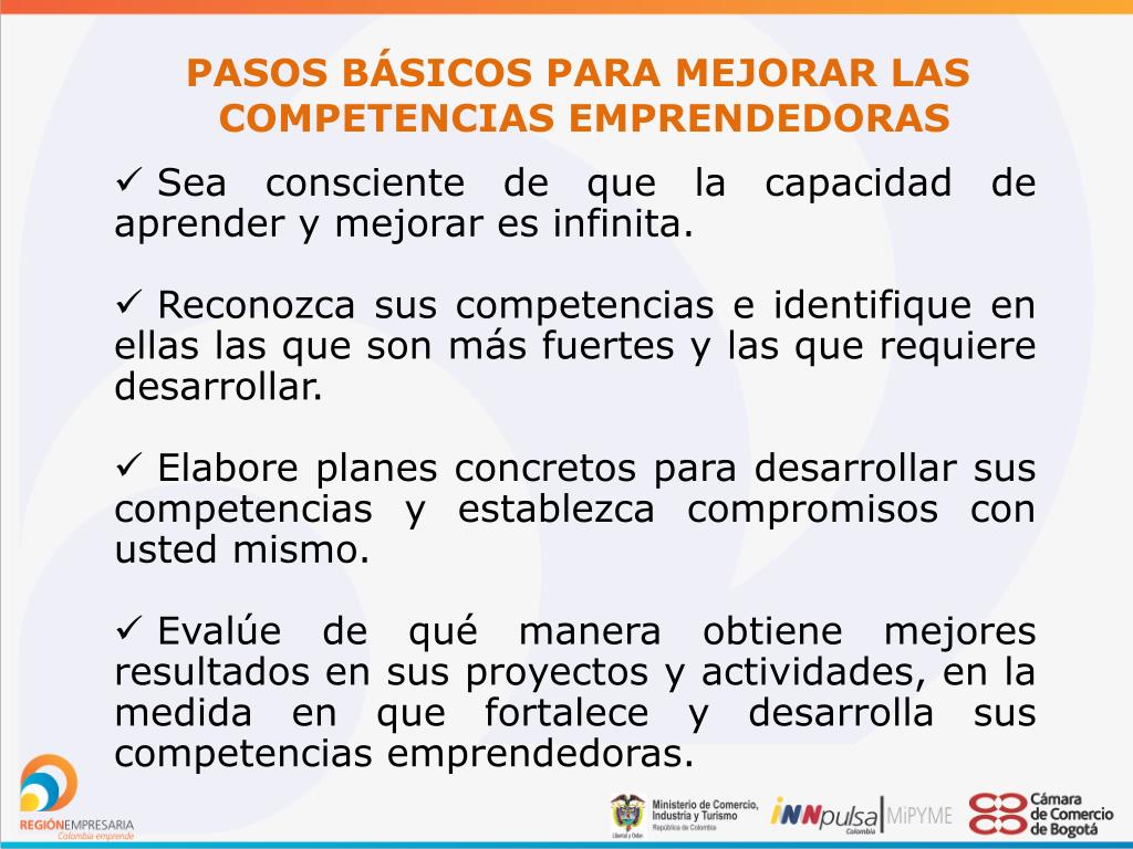 PASOS BÁSICOS PARA MEJORAR LAS COMPETENCIAS EMPRENDEDORAS • Sea consciente de que la capacidad de aprender y mejorar es infinita. • Reconozca sus competencias e identifique en ellas las que son más fuertes y las que requiere desarrollar. • Elabore planes concretos para desarrollar sus competencias y establezca compromisos con usted mismo. • Evalúe de qué manera obtiene mejores resultados en sus proyectos y actividades, en la medida en que fortalece y desarrolla sus competencias emprendedoras.