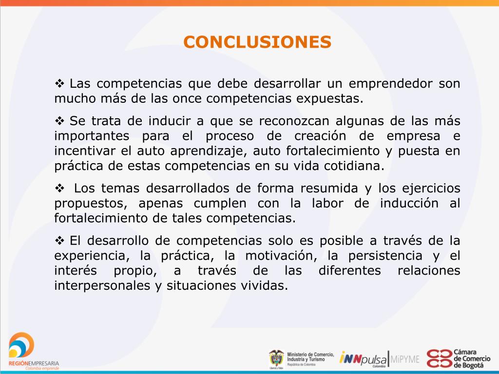 CONCLUSIONES • Las competencias que debe desarrollar un emprendedor son mucho más de las once competencias expuestas. • Se trata de inducir a que se reconozcan algunas de las más importantes para el proceso de creación de empresa e incentivar el auto aprendizaje, auto fortalecimiento y puesta en práctica de estas competencias en su vida cotidiana. • Los temas desarrollados de forma resumida y los ejercicios propuestos, apenas cumplen con la labor de inducción al fortalecimiento de tales competencias. • El desarrollo de competencias solo es posible a través de la experiencia, la práctica, la motivación, la persistencia y el interés propio, a través de las diferentes relaciones interpersonales y situaciones vividas.