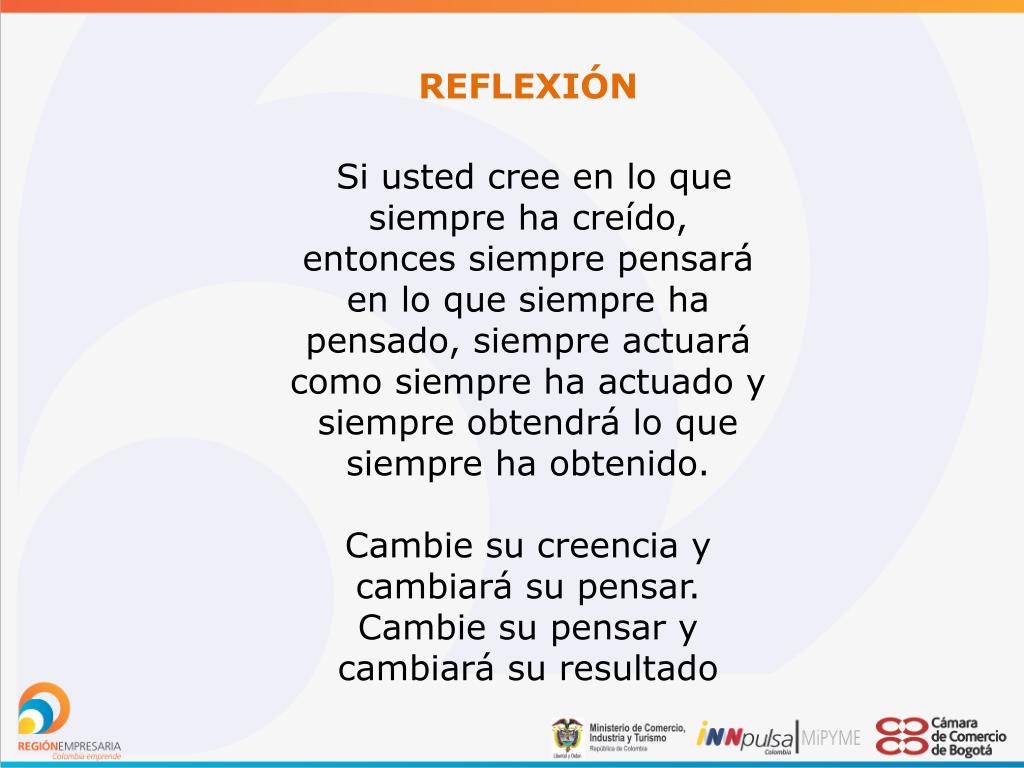 REFLEXIÓN Si usted cree en lo que siempre ha creído, entonces siempre pensará en lo que siempre ha pensado, siempre actuará como siempre ha actuado y siempre obtendrá lo que siempre ha obtenido. Cambie su creencia y cambiará su pensar. Cambie su pensar y cambiará su resultado