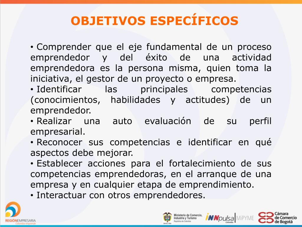 OBJETIVOS ESPECÍFICOS • Comprender que el eje fundamental de un proceso emprendedor y del éxito de una actividad emprendedora es la persona misma, quien toma la iniciativa, el gestor de un proyecto o empresa. • Identificar las principales competencias (conocimientos, habilidades y actitudes) de un emprendedor. • Realizar una auto evaluación de su perfil empresarial. • Reconocer sus competencias e identificar en qué aspectos debe mejorar. • Establecer acciones para el fortalecimiento de sus competencias emprendedoras, en el arranque de una empresa y en cualquier etapa de emprendimiento. • Interactuar con otros emprendedores.