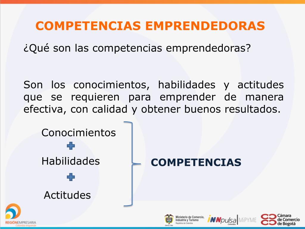 COMPETENCIAS EMPRENDEDORAS ¿Qué son las competencias emprendedoras? Son los conocimientos, habilidades y actitudes que se requieren para emprender de manera efectiva, con calidad y obtener buenos resultados. Conocimientos Habilidades COMPETENCIAS Actitudes