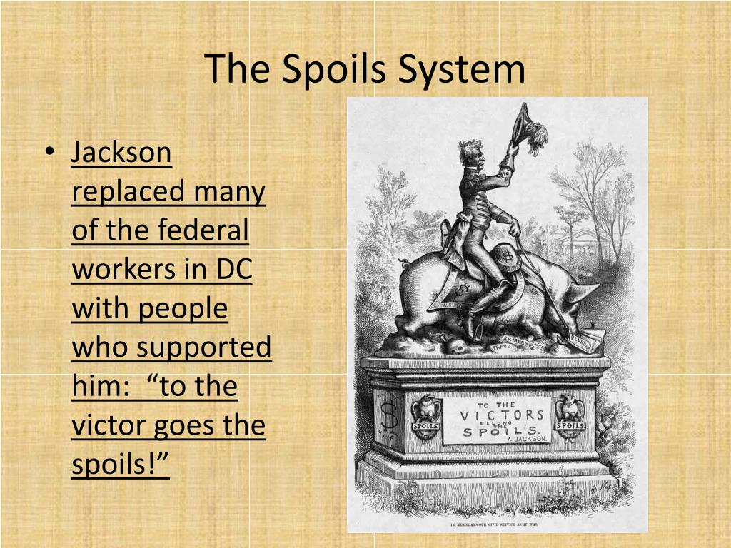 The Spoils System • Jackson replaced many of the federal workers in DC with people who supported him: “to the victor goes the spoils!”