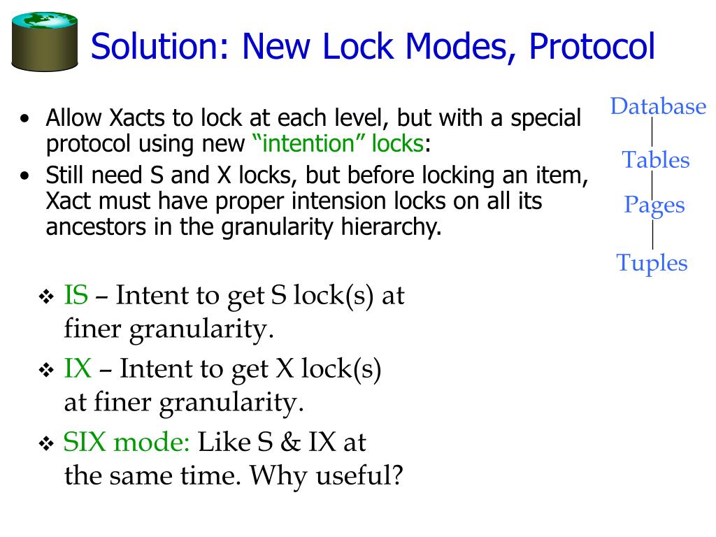 Database Tables Pages Tuples Solution: New Lock Modes, Protocol • Allow Xacts to lock at each level, but with a special protocol using new “intention” locks: • Still need S and X locks, but before locking an item, Xact must have proper intension locks on all its ancestors in the granularity hierarchy. • IS – Intent to get S lock(s) at finer granularity. • IX – Intent to get X lock(s) at finer granularity. • SIX mode: Like S & IX at the same time. Why useful?