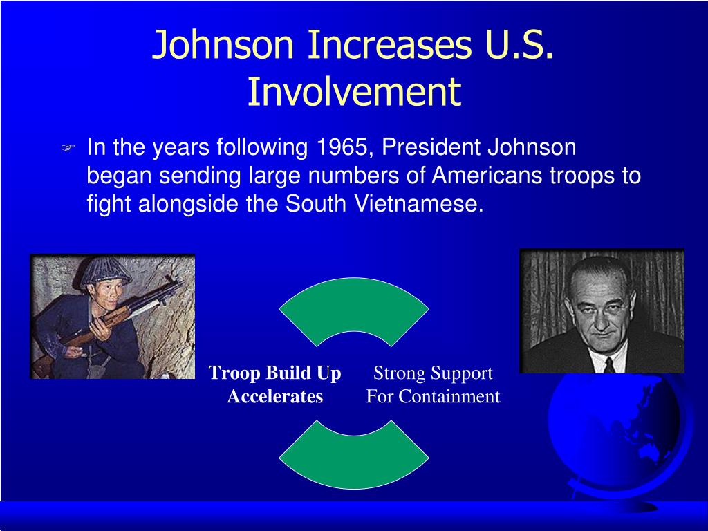 Johnson Increases U.S. Involvement • In the years following 1965, President Johnson began sending large numbers of Americans troops to fight alongside the South Vietnamese.