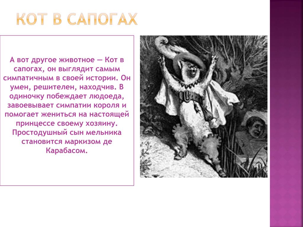 Кот в сапогах А вот другое животное — Кот в сапогах, он выглядит самым симпатичным в своей истории. Он умен, решителен, находчив. В одиночку побеждает людоеда, завоевывает симпатии короля и помогает жениться на настоящей принцессе своему хозяину. Простодушный сын мельника становится маркизом де Карабасом.