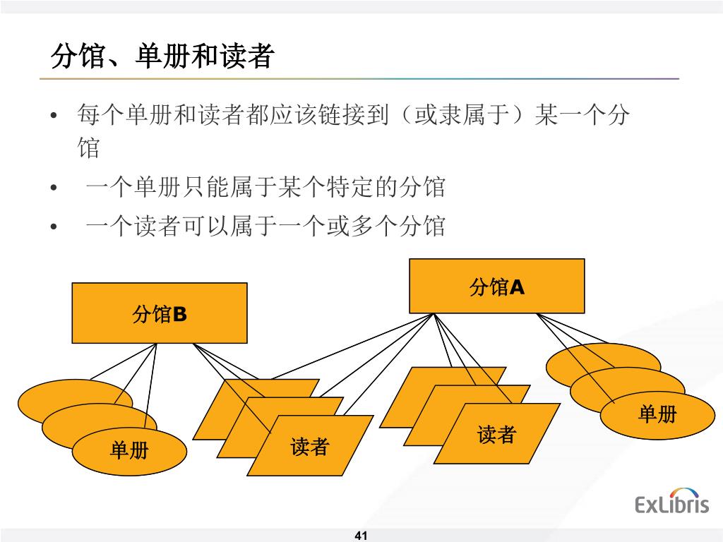 分馆(Sublibraries) • 最小的管理单元 – ADM库的一个特定复分( subdivision) • 单册、订单、预订、外借和其它等记录都在分馆级别上定义。 • 每个分馆有自己独立的流通政策 • 不同功能的权限管理也在分馆级别上定义。