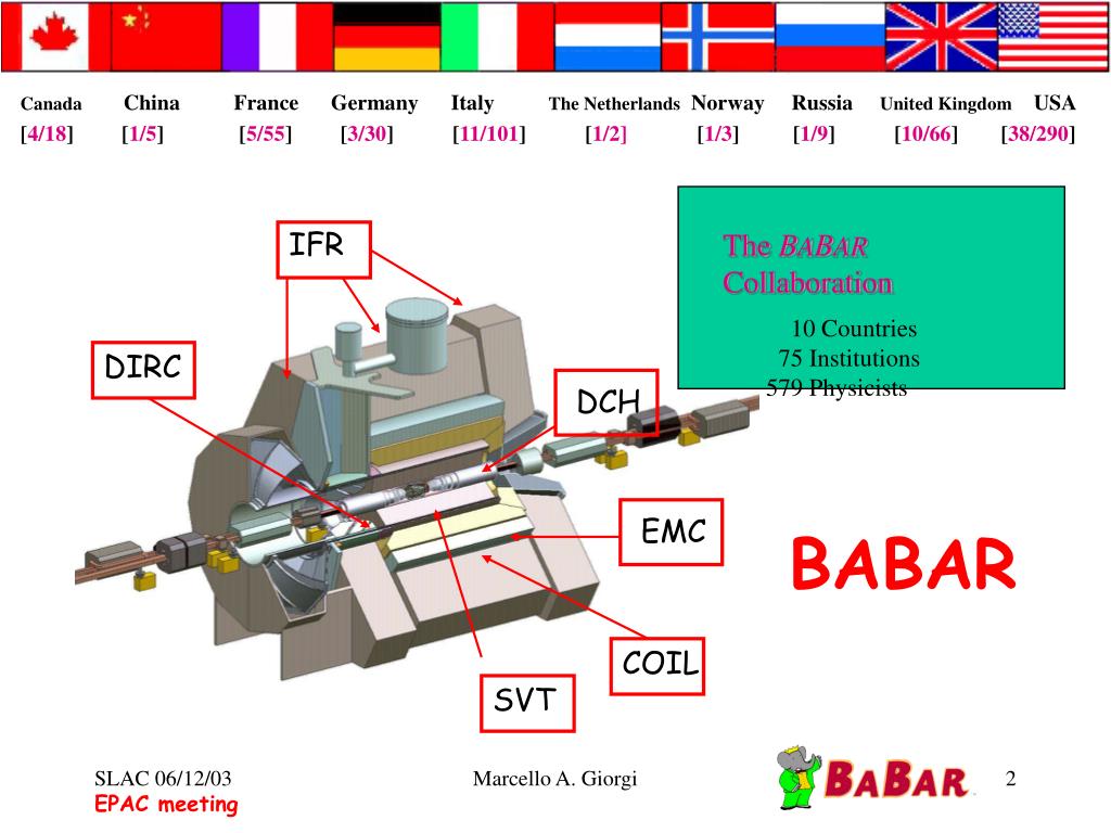 BABAR Canada China France Germany Italy The Netherlands Norway Russia United Kingdom USA [4/18] [1/5] [5/55] [3/30] [11/101] [1/2] [1/3] [1/9] [10/66] [38/290] The BABAR Collaboration 10 Countries 75 Institutions 579 Physicists IFR DIRC DCH EMC COIL SVT Marcello A. Giorgi