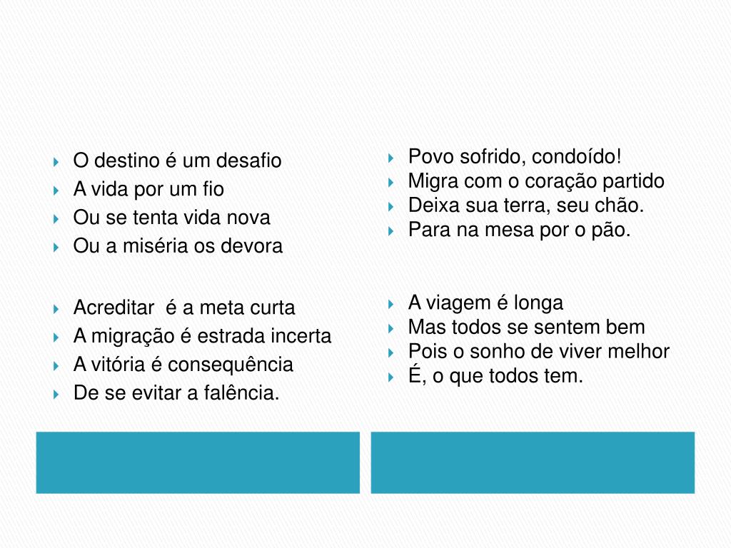 O destino é um desafio • A vida por um fio • Ou se tenta vida nova • Ou a miséria os devora • Acreditar é a meta curta • A migração é estrada incerta • A vitória é consequência • De se evitar a falência. • Povo sofrido, condoído! • Migra com o coração partido • Deixa sua terra, seu chão. • Para na mesa por o pão. • A viagem é longa • Mas todos se sentem bem • Pois o sonho de viver melhor • É, o que todos tem.