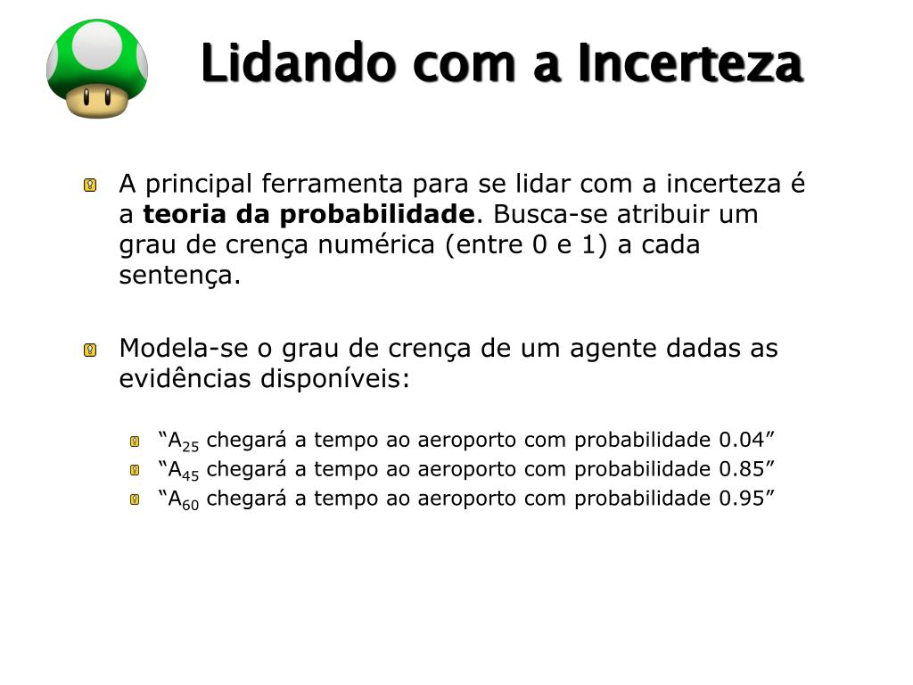 Lidando com a Incerteza • A principal ferramenta para se lidar com a incerteza é a teoria da probabilidade. Busca-se atribuir um grau de crença numérica (entre 0 e 1) a cada sentença. • Modela-se o grau de crença de um agente dadas as evidências disponíveis: • “A25 chegará a tempo ao aeroporto com probabilidade 0.04” • “A45 chegará a tempo ao aeroporto com probabilidade 0.85” • “A60 chegará a tempo ao aeroporto com probabilidade 0.95”