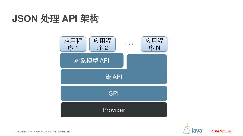 JSON 处理 API 架构 … 应用程序 1 应用程序 2 应用程序 N 对象模型 API 流 API SPI Provider