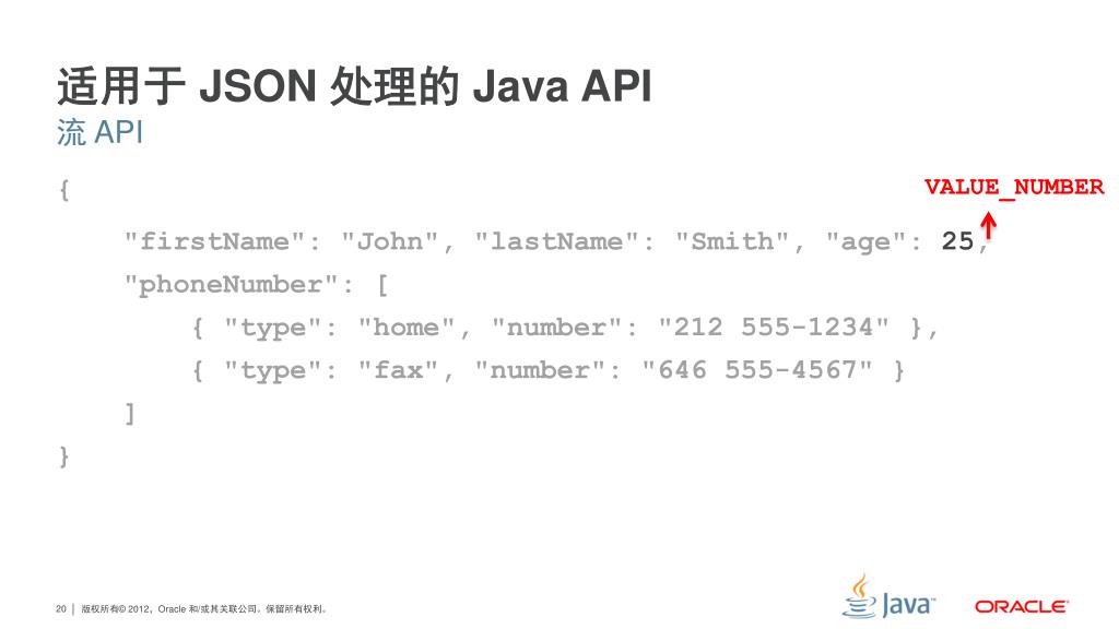 适用于 JSON 处理的 Java API 流 API VALUE_NUMBER { "firstName": "John", "lastName": "Smith", "age": 25, "phoneNumber": [ { "type": "home", "number": "212 555-1234" }, { "type": "fax", "number": "646 555-4567" } ] }