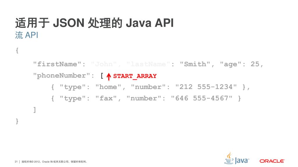 适用于 JSON 处理的 Java API 流 API { "firstName": "John", "lastName": "Smith", "age": 25, "phoneNumber": [ { "type": "home", "number": "212 555-1234" }, { "type": "fax", "number": "646 555-4567" } ] } START_ARRAY