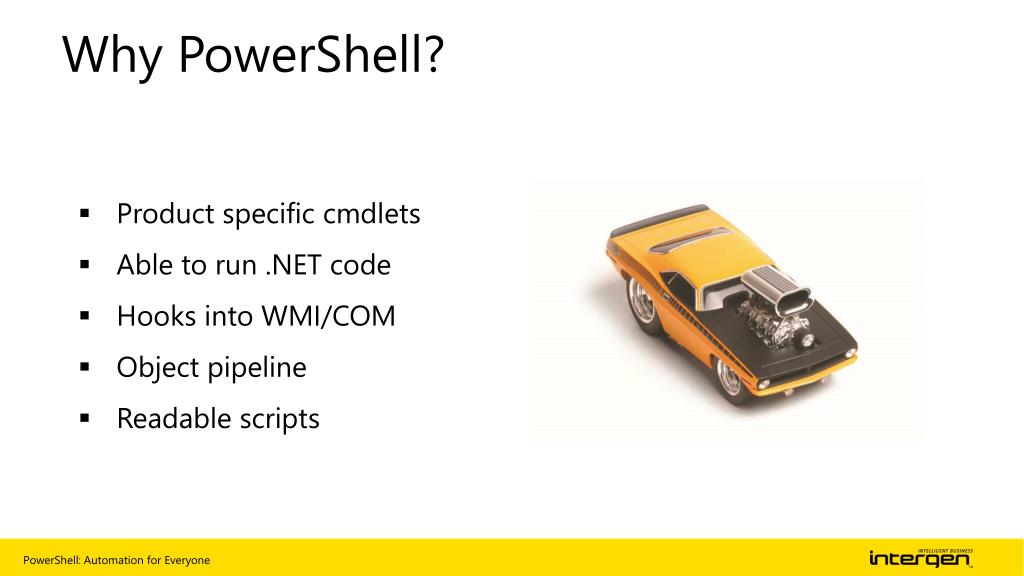 Why PowerShell? Product specific cmdlets Able to run .NET code Hooks into WMI/COM Object pipeline Readable scripts