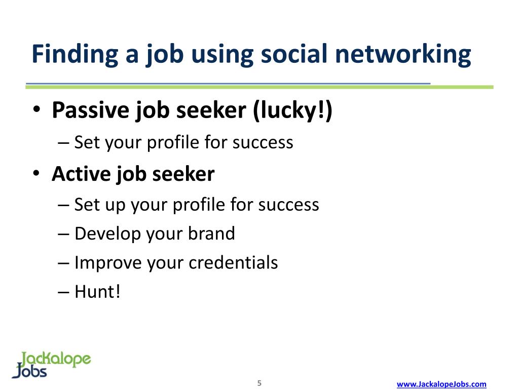 Finding a job using social networking • Passive job seeker (lucky!) • Set your profile for success • Active job seeker • Set up your profile for success • Develop your brand • Improve your credentials • Hunt!