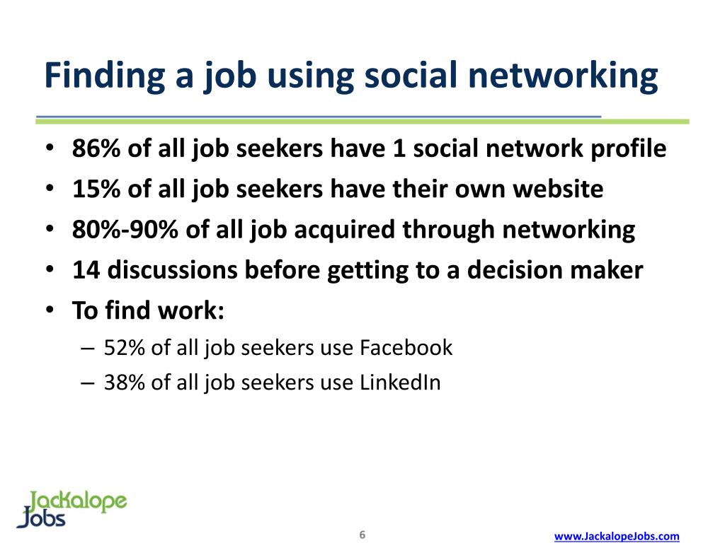 Finding a job using social networking • 86% of all job seekers have 1 social network profile • 15% of all job seekers have their own website • 80%-90% of all job acquired through networking • 14 discussions before getting to a decision maker • To find work: • 52% of all job seekers use Facebook • 38% of all job seekers use LinkedIn