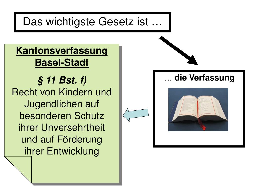 Kantonsverfassung Basel-Stadt § 11 Bst. f)Recht von Kindern und Jugendlichen auf besonderen Schutz ihrer Unversehrtheit und auf Förderung ihrer Entwicklung … die Verfassung Das wichtigste Gesetz ist …