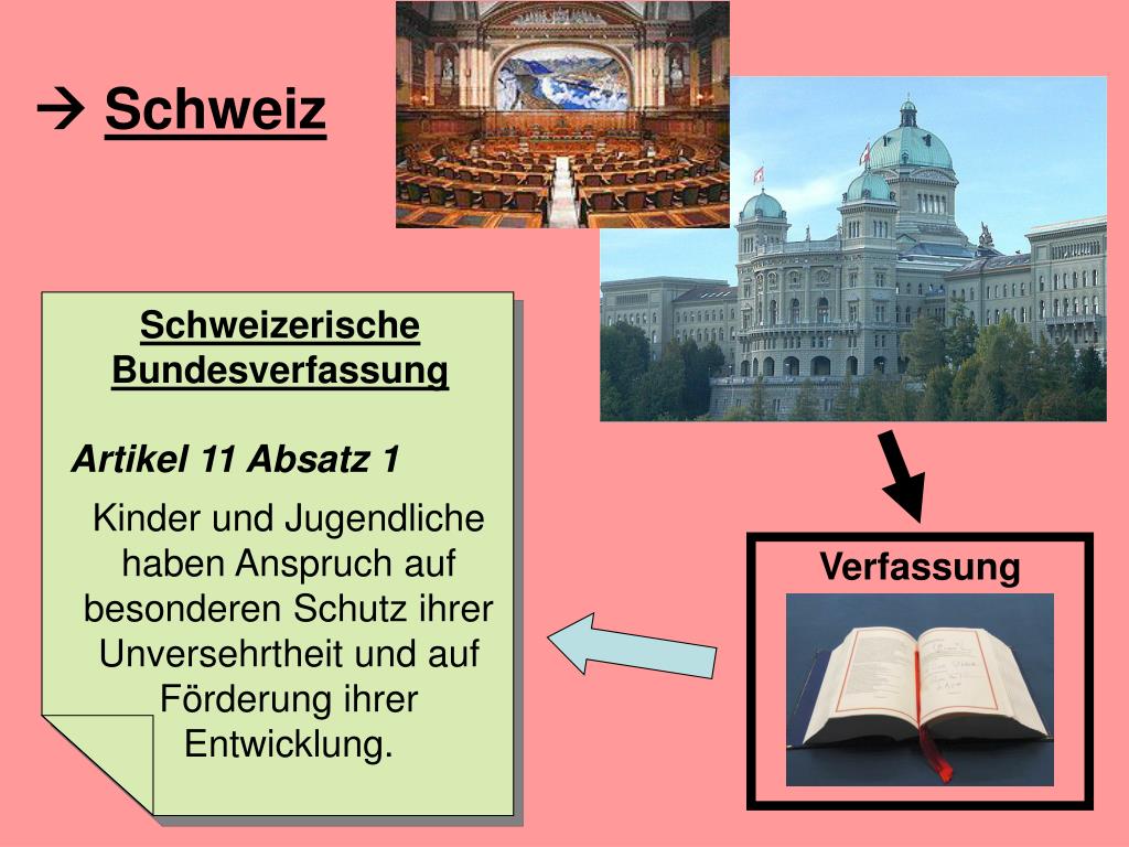 Schweizerische Bundesverfassung Artikel 11 Absatz 1 Kinder und Jugendliche haben Anspruch auf besonderen Schutz ihrer Unversehrtheit und auf Förderung ihrer Entwicklung. Schweiz Verfassung