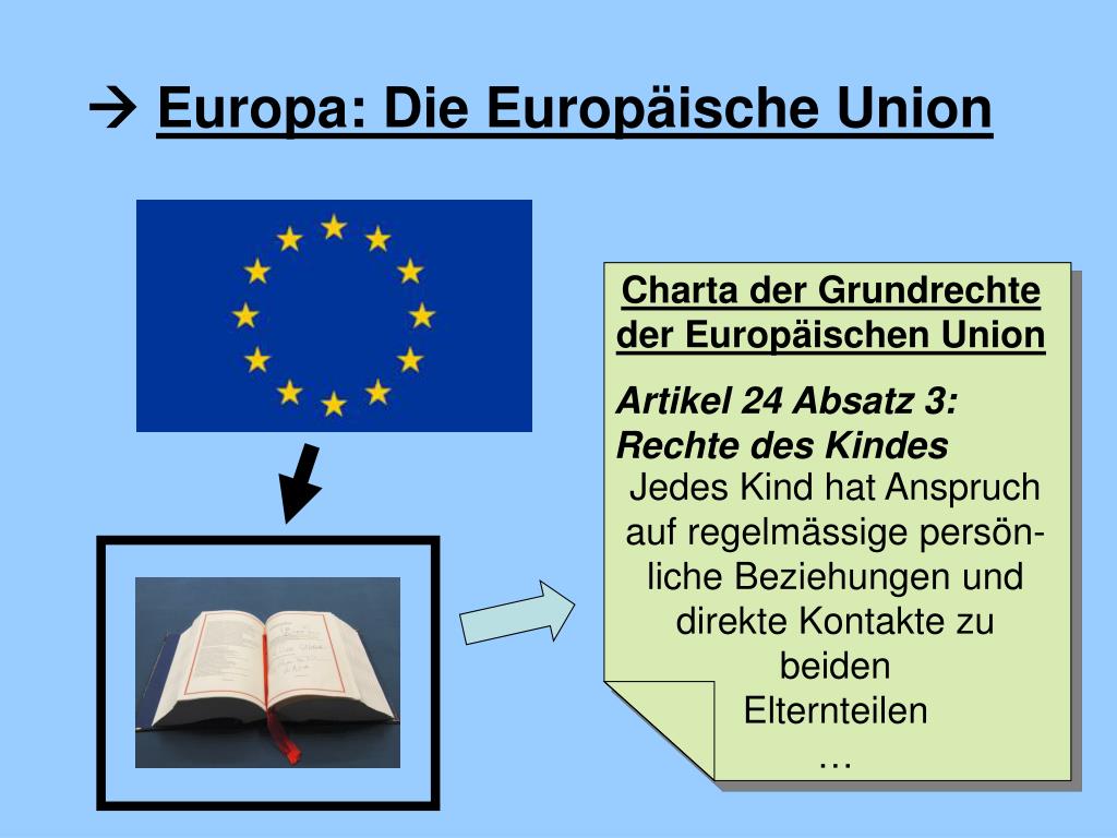 Charta der Grundrechte der Europäischen Union Artikel 24 Absatz 3: Rechte des Kindes Jedes Kind hat Anspruch auf regelmässige persön-liche Beziehungen und direkte Kontakte zu beiden Elternteilen… Europa: Die Europäische Union