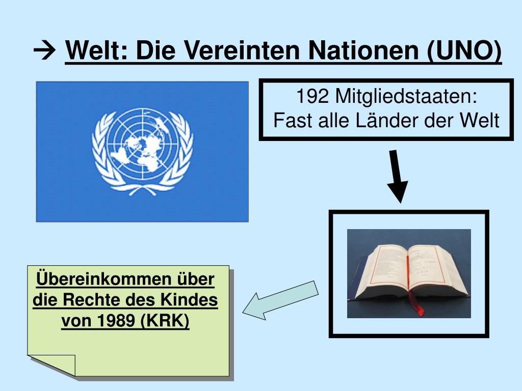 Übereinkommen über die Rechte des Kindes von 1989 (KRK) Welt: Die Vereinten Nationen (UNO) 192 Mitgliedstaaten:Fast alle Länder der Welt