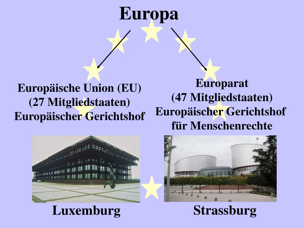 Europa Europarat (47 Mitgliedstaaten) Europäischer Gerichtshof für Menschenrechte Europäische Union (EU) (27 Mitgliedstaaten) Europäischer Gerichtshof Strassburg Luxemburg