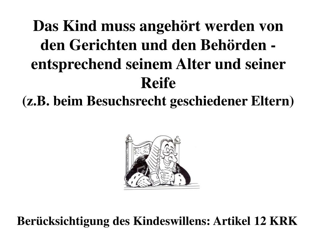 Das Kind muss angehört werden von den Gerichten und den Behörden - entsprechend seinem Alter und seiner Reife (z.B. beim Besuchsrecht geschiedener Eltern) Berücksichtigung des Kindeswillens: Artikel 12 KRK