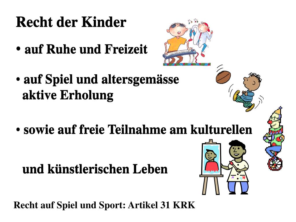 Recht der Kinder • auf Ruhe und Freizeit • auf Spiel und altersgemässe aktive Erholung • sowie auf freie Teilnahme am kulturellen • und künstlerischen Leben • Recht der Kinder • auf Ruhe und Freizeit • auf Spiel und altersgemässe aktive Erholung • sowie auf freie Teilnahme am kulturellen • und künstlerischen Leben Recht auf Spiel und Sport: Artikel 31 KRK