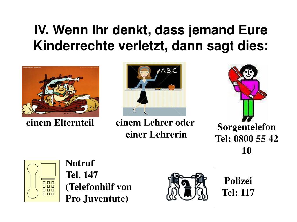einem Lehrer oder einer Lehrerin einem Elternteil Sorgentelefon Tel: 0800 55 42 10 Notruf Tel. 147 (Telefonhilf von Pro Juventute) Polizei Tel: 117 IV. Wenn Ihr denkt, dass jemand Eure Kinderrechte verletzt, dann sagt dies:
