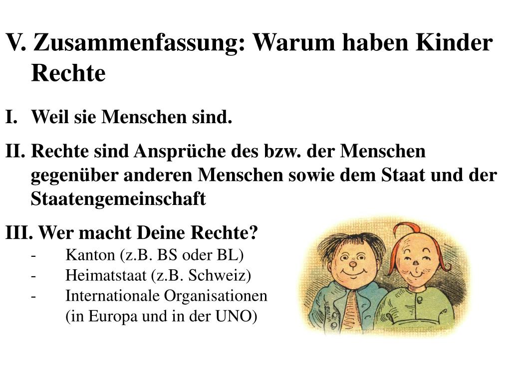 V. Zusammenfassung: Warum haben Kinder Rechte • Weil sie Menschen sind. • Rechte sind Ansprüche des bzw. der Menschen • gegenüber anderen Menschen sowie dem Staat und der Staatengemeinschaft • III. Wer macht Deine Rechte? • - Kanton (z.B. BS oder BL) • - Heimatstaat (z.B. Schweiz) • - Internationale Organisationen • (in Europa und in der UNO)
