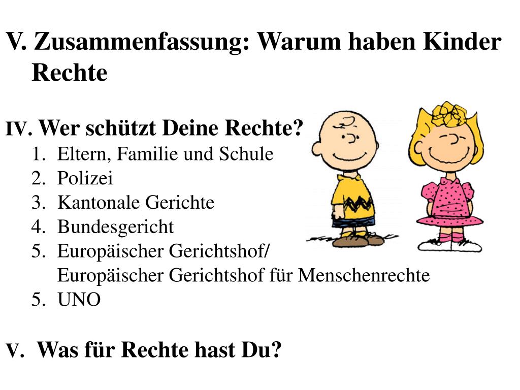 V. Zusammenfassung: Warum haben Kinder Rechte • Wer schützt Deine Rechte? • Eltern, Familie und Schule • Polizei • Kantonale Gerichte • Bundesgericht • Europäischer Gerichtshof/ • Europäischer Gerichtshof für Menschenrechte • UNO • Was für Rechte hast Du?